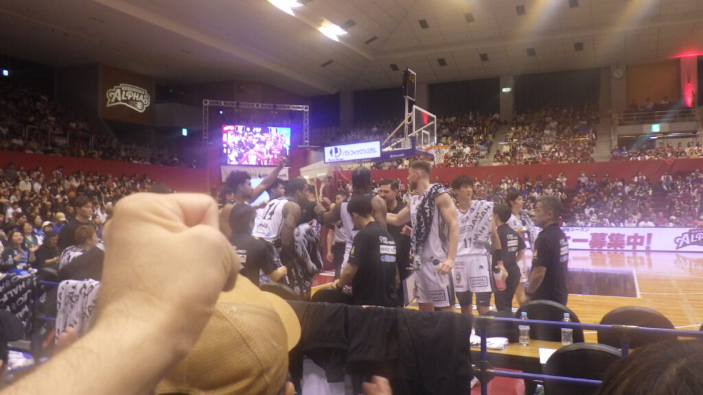 肝心の試合の方ですが、まずは土曜日のゲーム1、ビュフォード、ニックケイがダブルダブル、津山くんも16ポイントと躍動、86-56の快勝でした!一番盛り上がったのが第4クォーター残り2分30秒、大橋くんが登場、見事に3ポイントシュートを決めた瞬間です!スタンドが爆発するような盛り上がりを見せました。