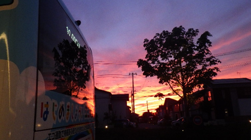 うなだれて帰りのシャトルバスに乗り込もうと、ふと空を見上げると宍道湖のような美しい夕陽が見られました。
